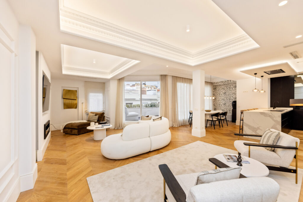 Una parte importante de la oferta procede de edificios históricos que se han rehabilitado con mimo, respetando elementos originales como molduras, carpinterías o suelos hidráulicos, pero integrando domótica, climatización por zonas, aislamiento avanzado y diseños de interior firmados por estudios especializados. Este tipo de producto, escaso y muy demandado, es el que sostiene los tramos más altos de precio y marca la pauta del mercado, con zonas ultra-prime como Recoletos alcanzando más de 15.000 €/m² en transacciones recientes.