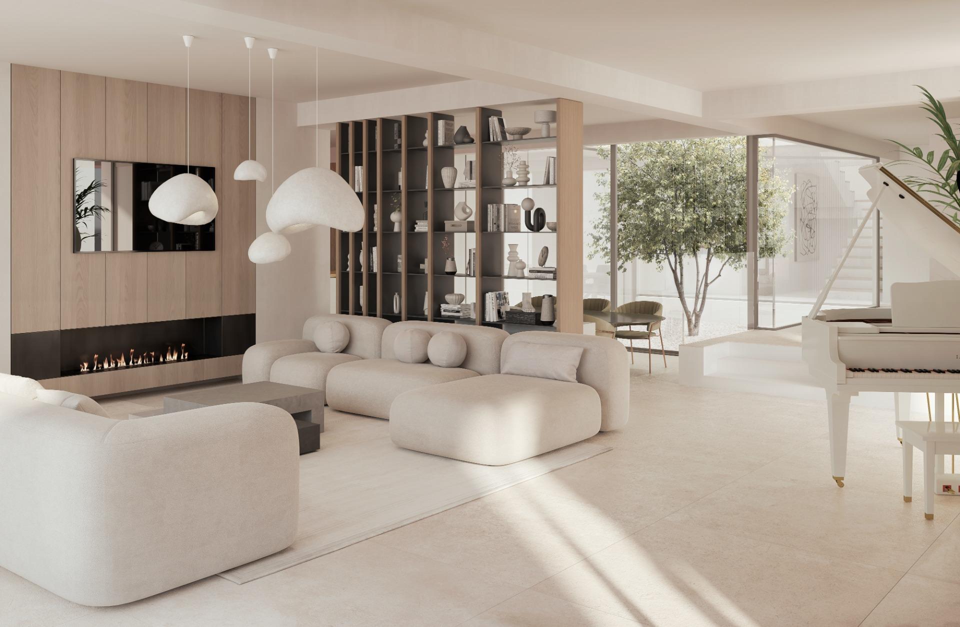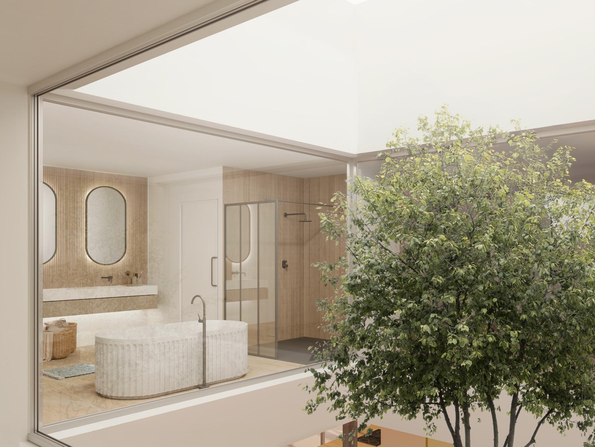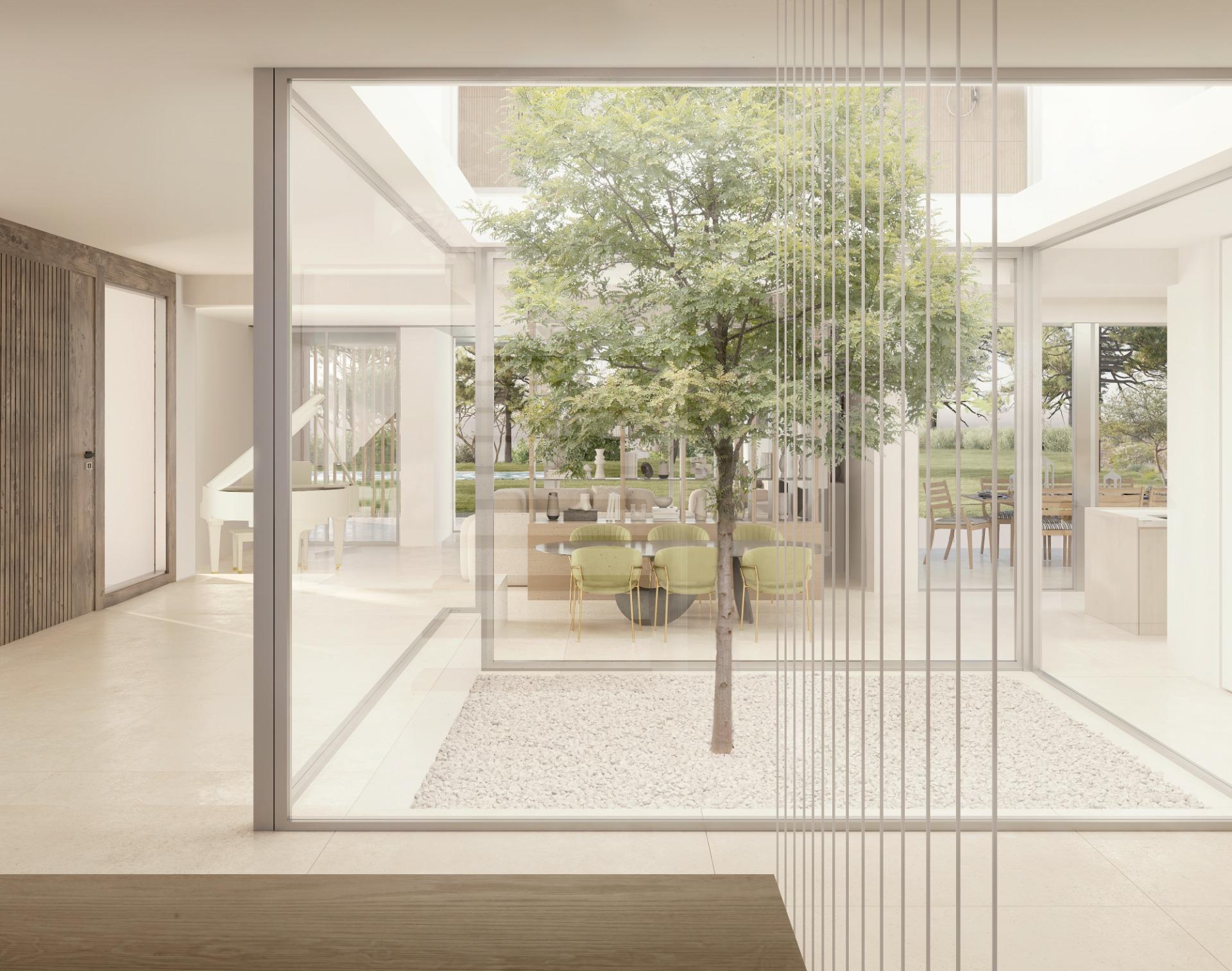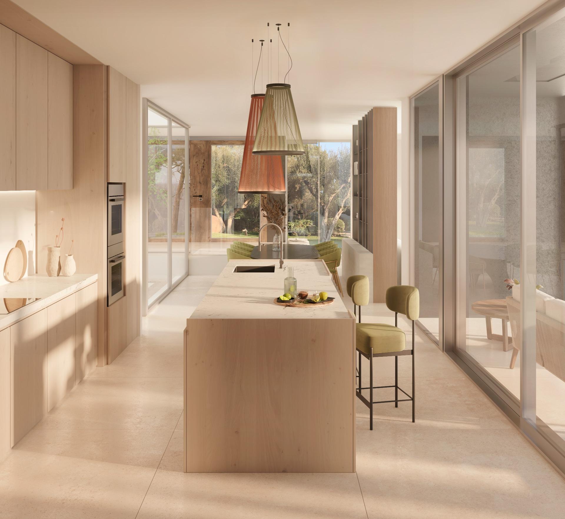 La cocina, abierta y muy luminosa, está equipada con grandes ventanales panorámicos de suelo a techo, que proporcionan una conexión fluida con el entorno. Dispone de acceso directo a un patio interior, lo que favorece la entrada de luz natural y crea un ambiente cálido y acogedor.