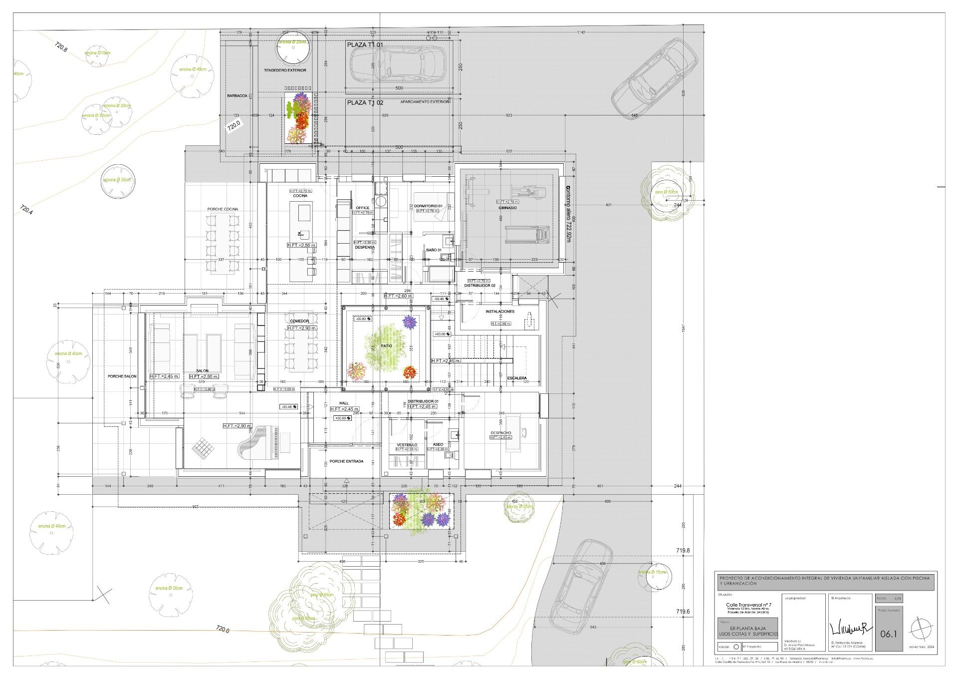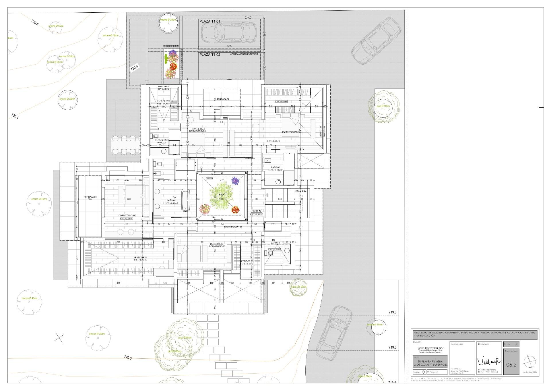 El patio central, ubicado en la planta baja, funciona como eje vertebrador de la vivienda, articulando las tres zonas principales: área de servicio, área social y área privada.