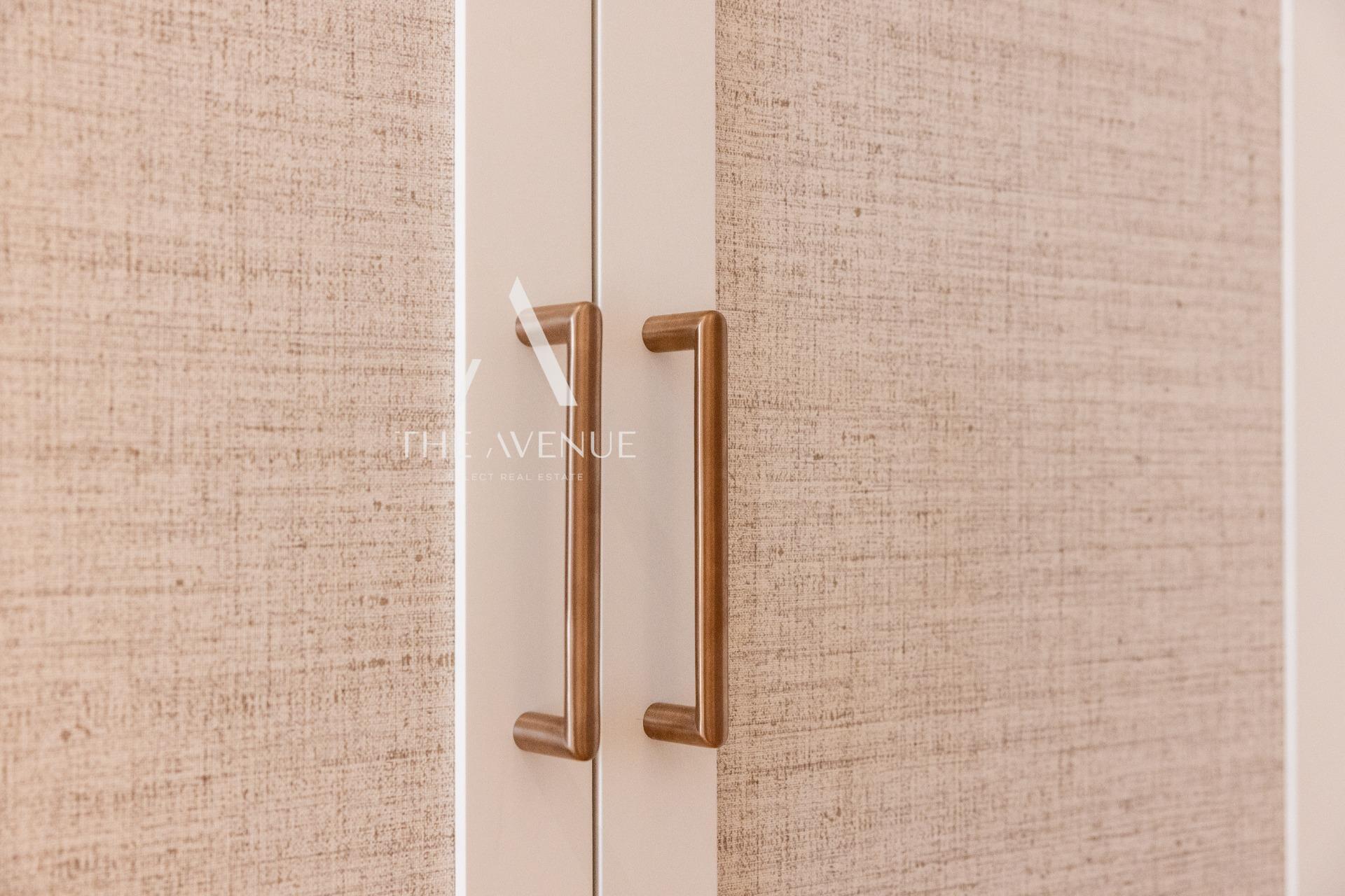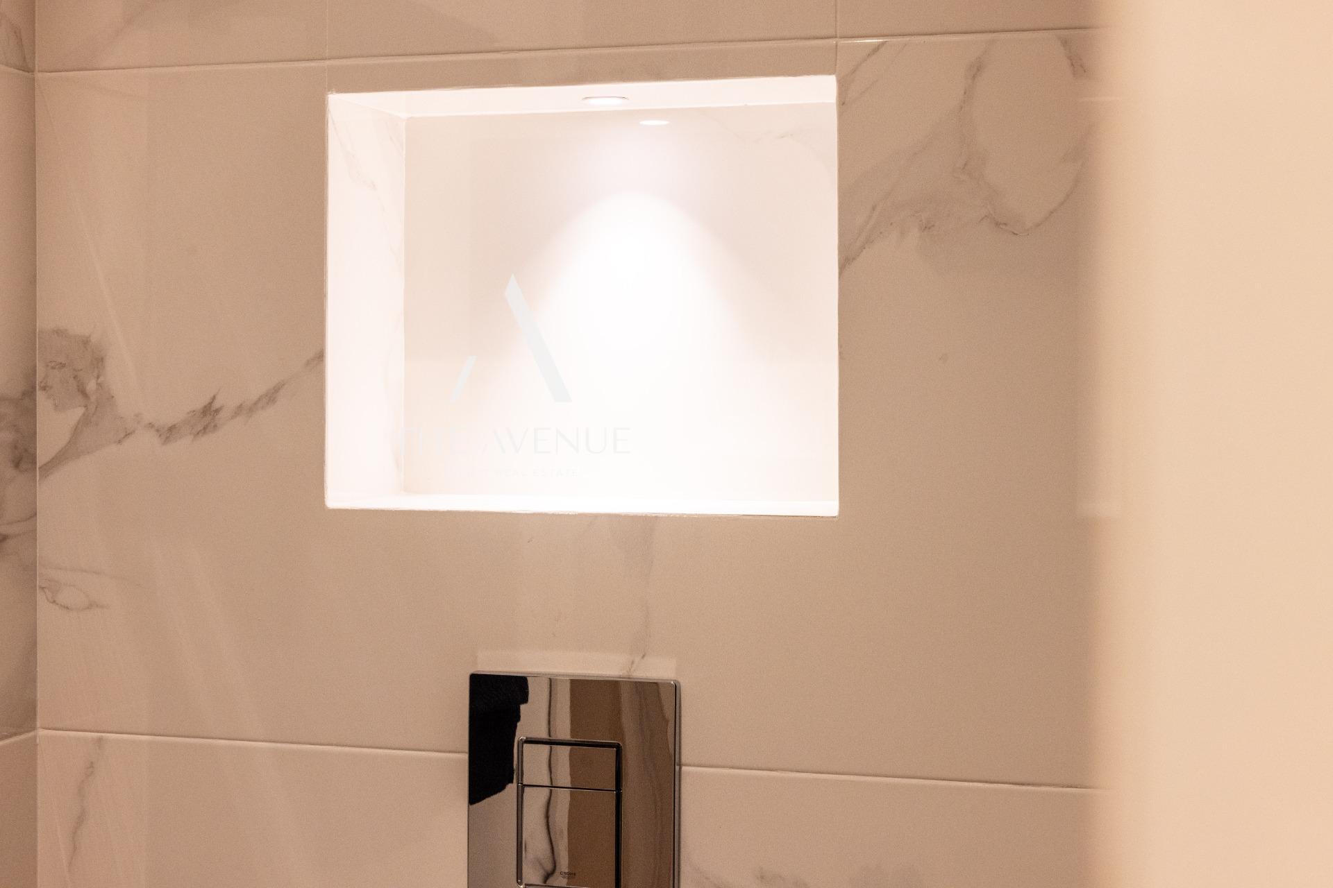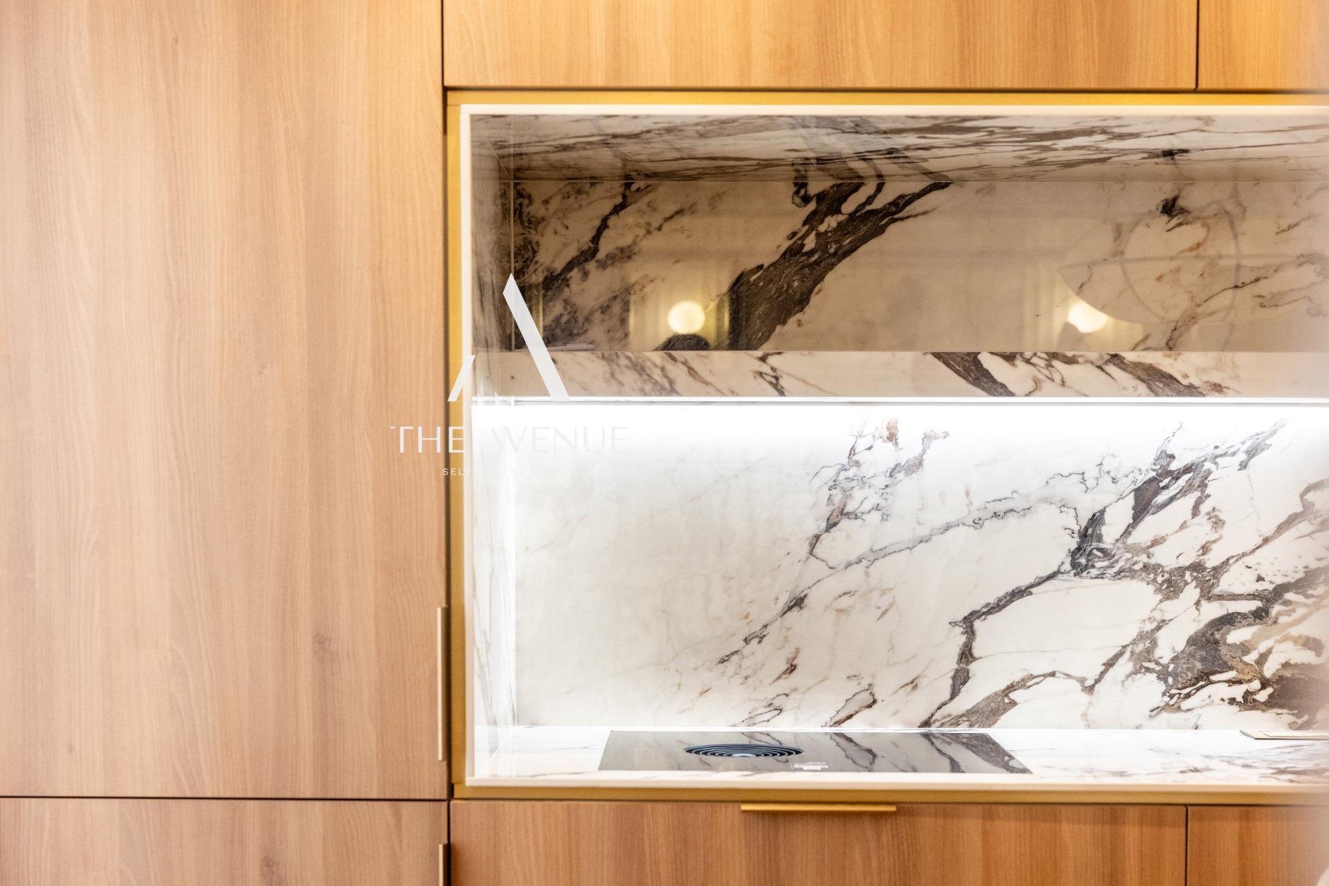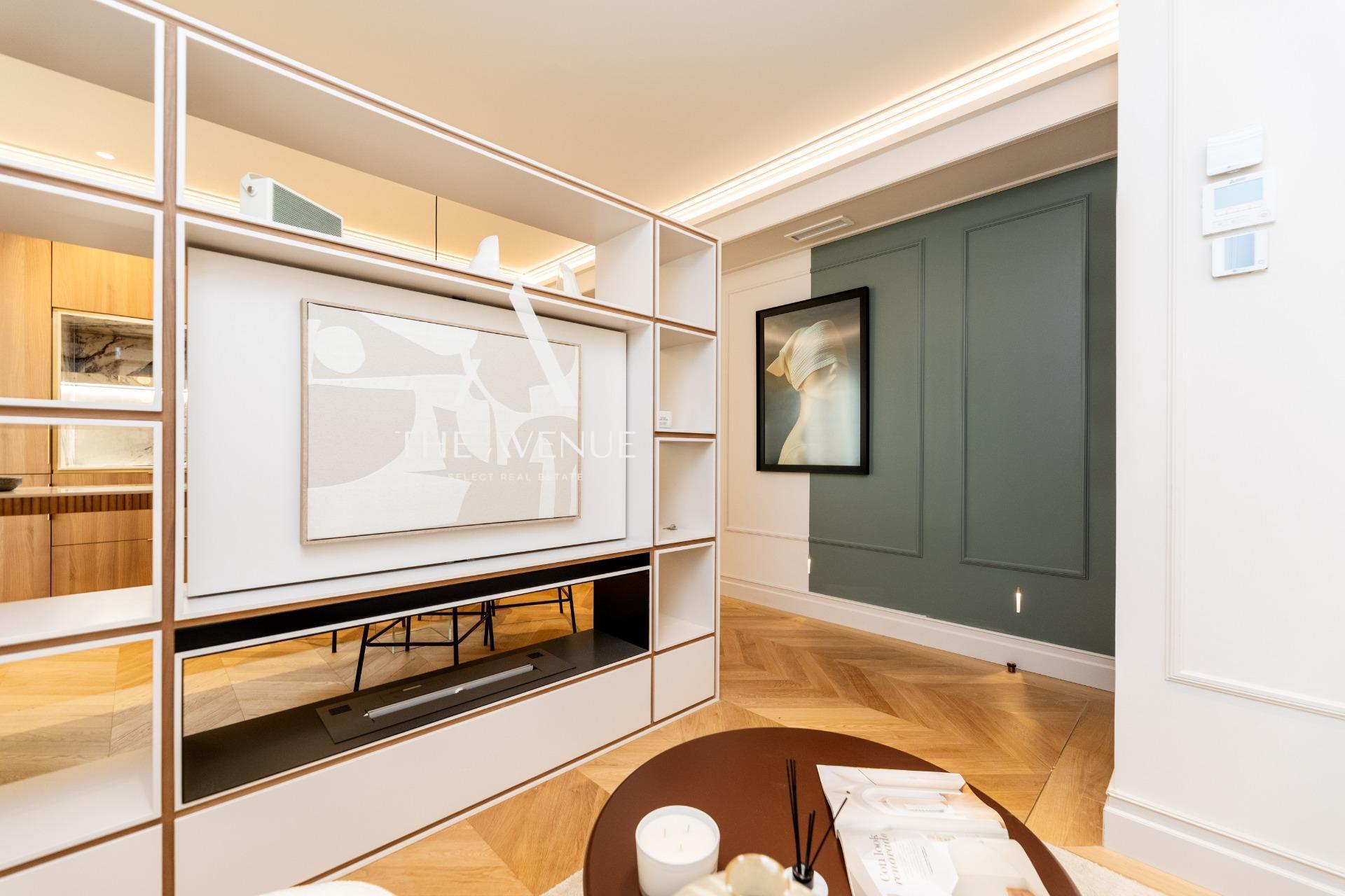 Se accede al salón con cocina americana totalmente equipada con electrodomésticos de primer nivel Este espacio esta integrado pero separado por una estantería que tiene posibilidad de montar TV en soporte giratoria para ver la TV desde la zona de estar o la cocina. Este espacio se abre al pasillo distribuidor con armarios para ropa de hogar, laundry con almacenaje, acceso a un dormitorio doble con armario empotrado, a un baño completo que da servicio a este dormitorio y a las visitas y al dormitorio principal con baño en suite y armario empotrado.