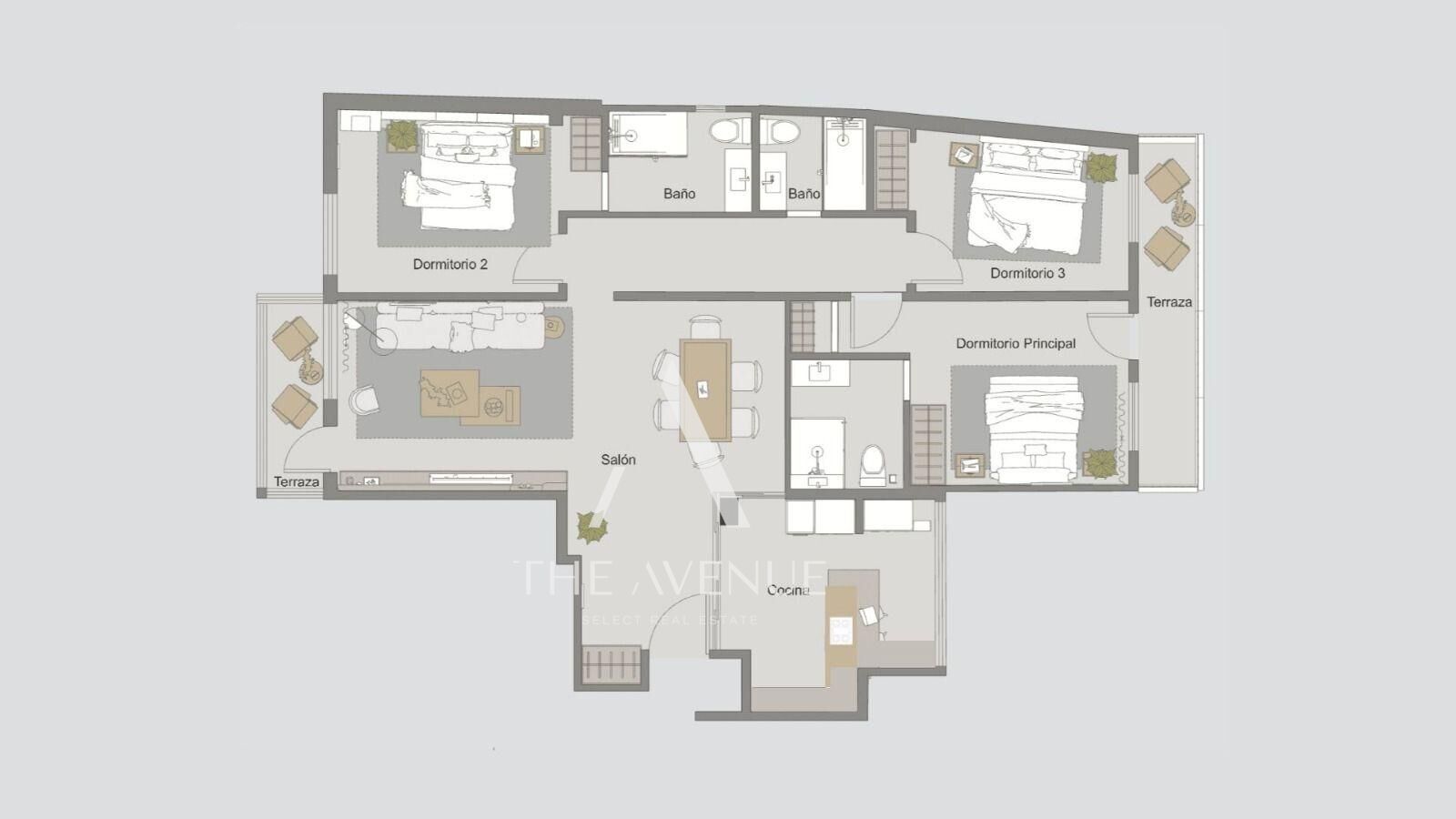 Se accede a un recibidor que se abre a un amplio salón comedor con salida a una terraza corrida, acceso a la cocina completa con office y al pasillo distribuidor que da paso al dormitorio principal con baño en suite y acceso a una terraza corrida, a otros dos dormitorios dobles uno de ellos con baño en suite y a otro baño completo.